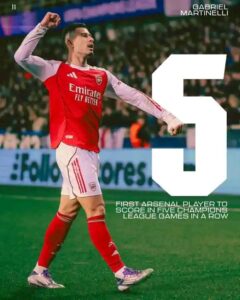 ጋብርኤል ማርቲኔሊ በ5 ተከታታይ የሻምፒዮንስ ሊግ ጨዋታዎች ጎል ያስቆጠረ የመጀመሪያው የአርሰናል ተጫዋች ሆነ