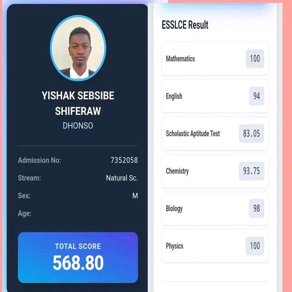 በኮሬ ዞን የዶንሶ 2ኛ ደረጃ ትምህርት ቤት የተፈጥሮ ሳይንስ ተማሪ የሆነው ይስሐቅ ሰብስቤ፤ ጊዜዬን በአግባቡ በመጠቀሜና ጠንክሬ በማጥናቴ 568/600 ውጤት ማስመዝገብ ችያለሁ ብሏል።